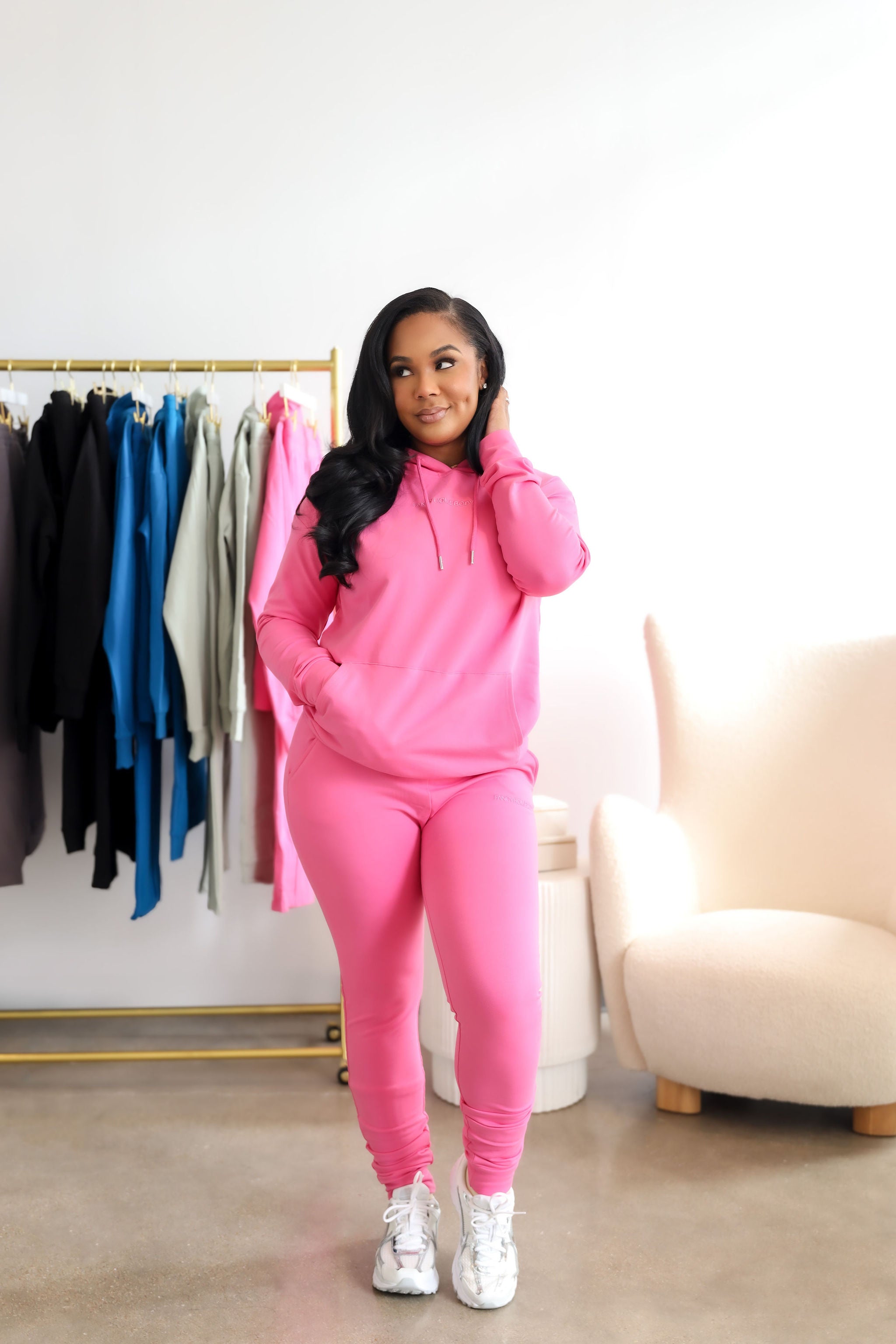 It features a high-waist, fitted jogger with in-seam pockets and a relaxed, pull-over hoodie with a cozy, flattering drape. Both pieces are crafted from our premium stretch cotton blend and finished with our signature puff-embroidered logo — a subtle detail that speaks to elevated ease.