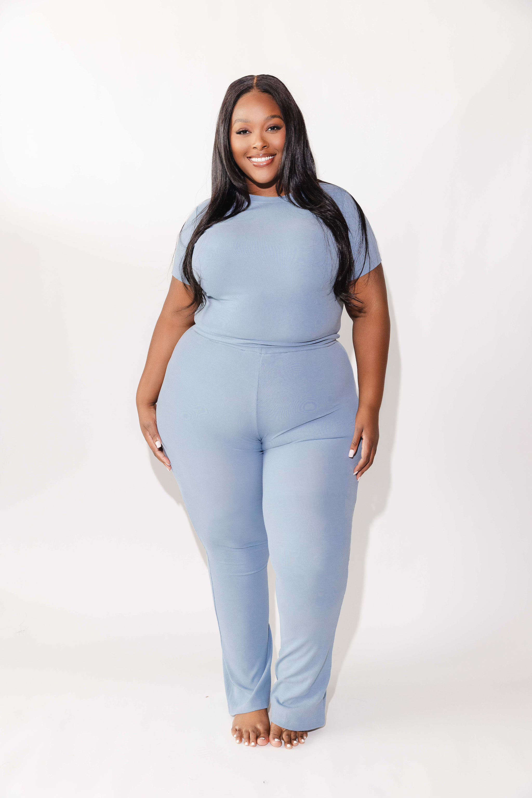 A super chic twist on a classic! This 2PC set includes full length, crew neck tee and matching high waist flared leggings. Made from our incredibly soft and stretchy Signature Ribbed fabric, this set is made for all-day wear you'll want to live in.