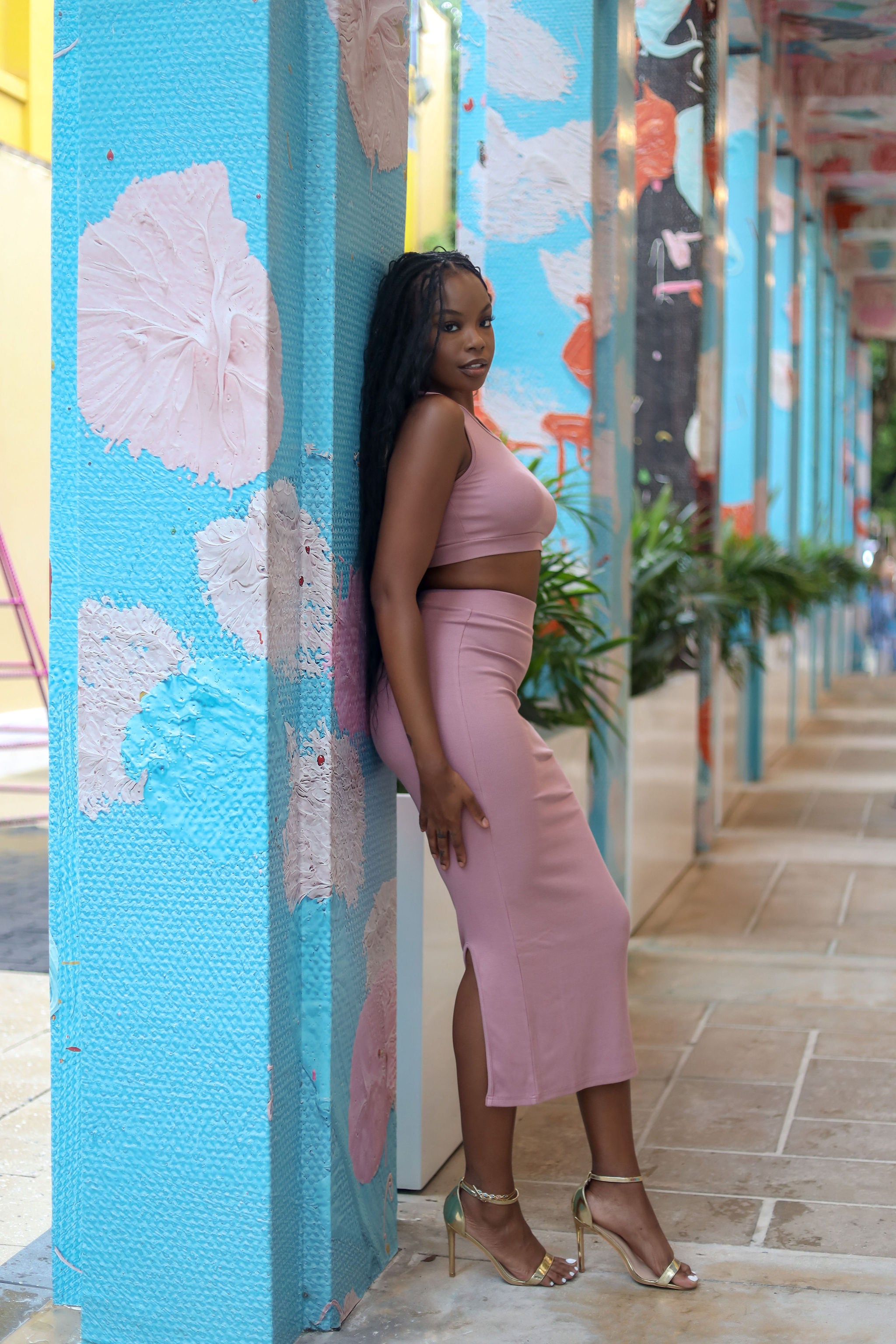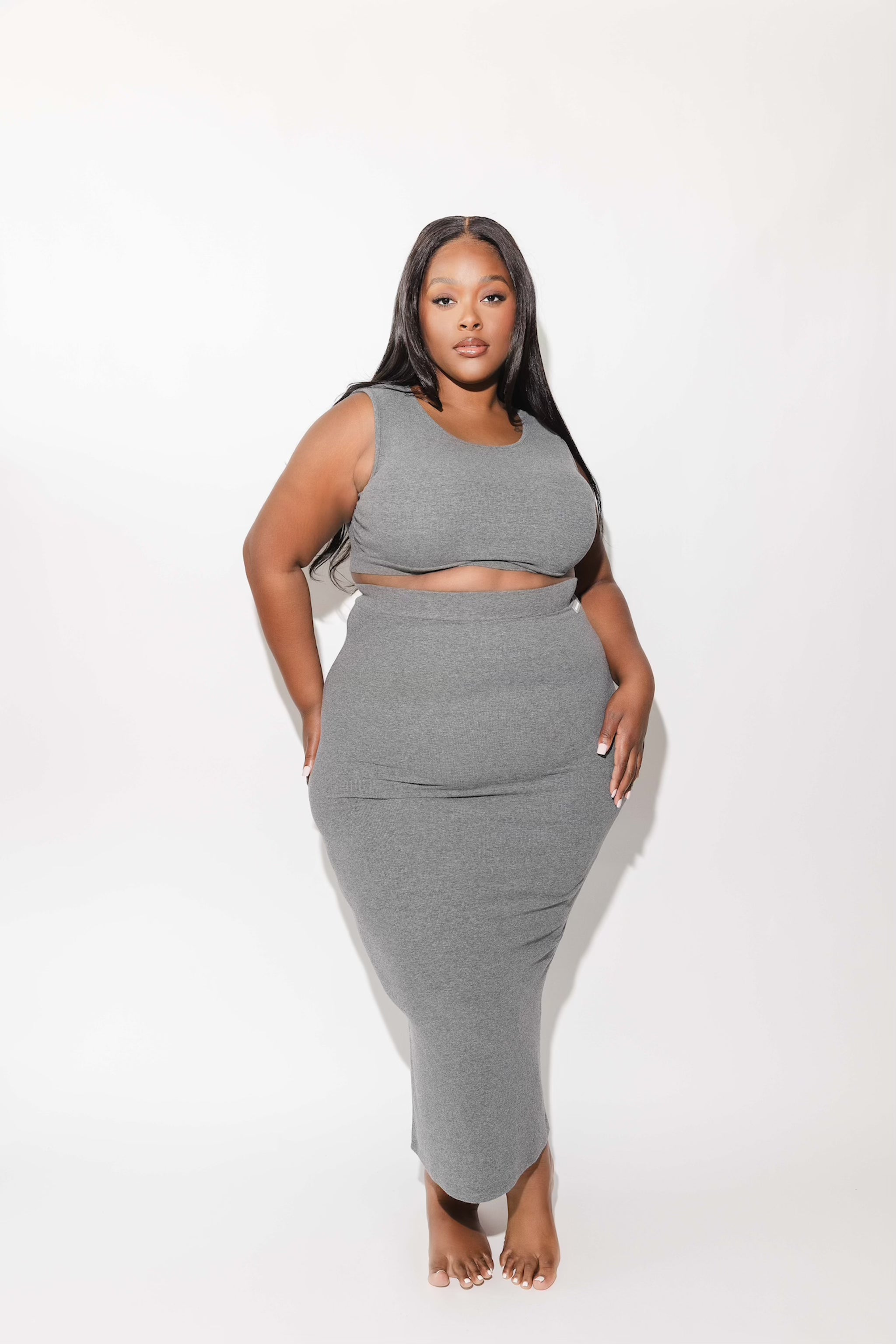 Easy, breezy, effortless! Made from our soft and stretchy Signature Ribbed fabric, this sporty-chic design can easily be dressed up or down! Set features cropped sleeveless tank with a high scoop neckline and matching midi length pencil skirt with back slit for added comfort and ease.