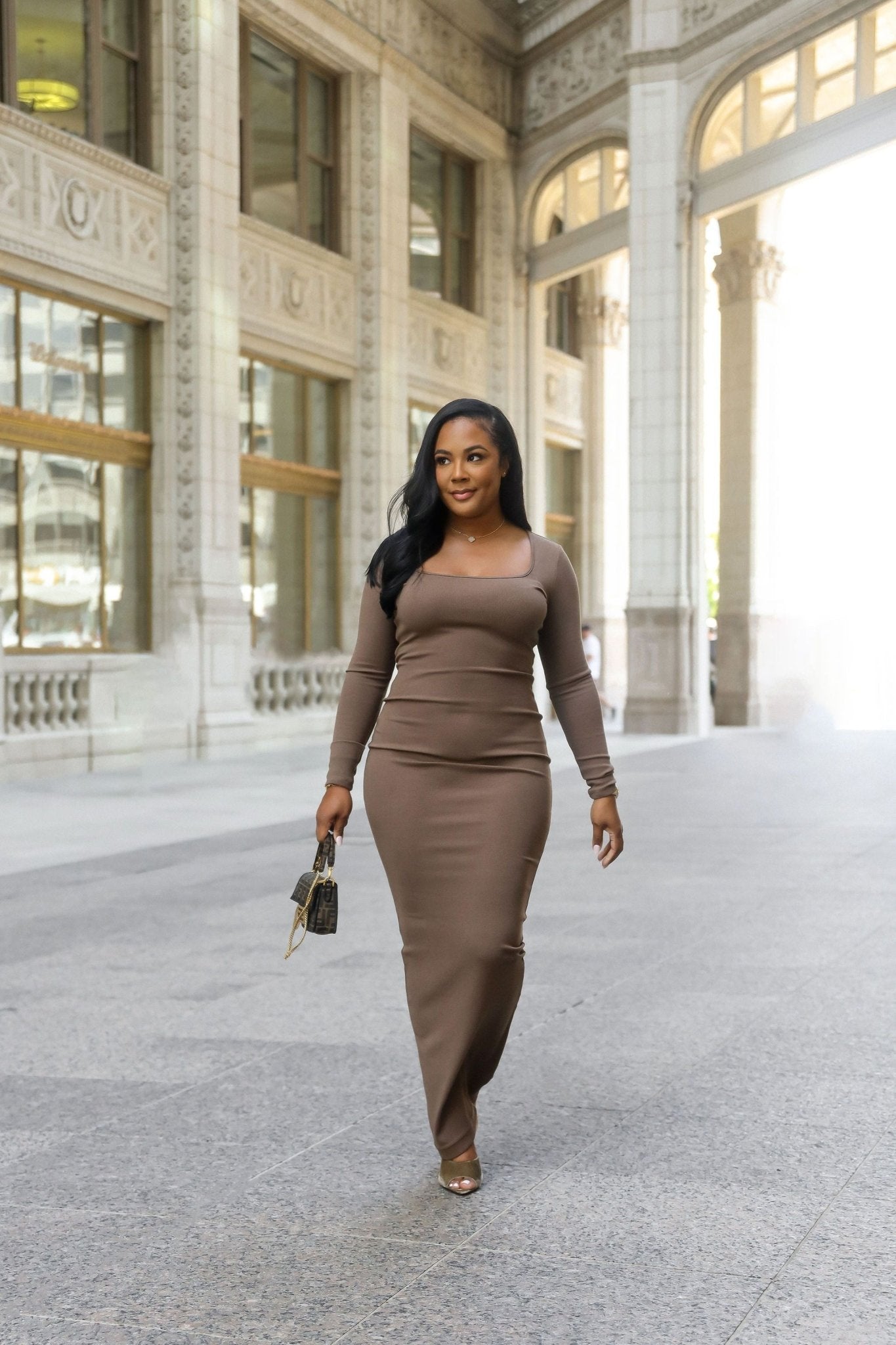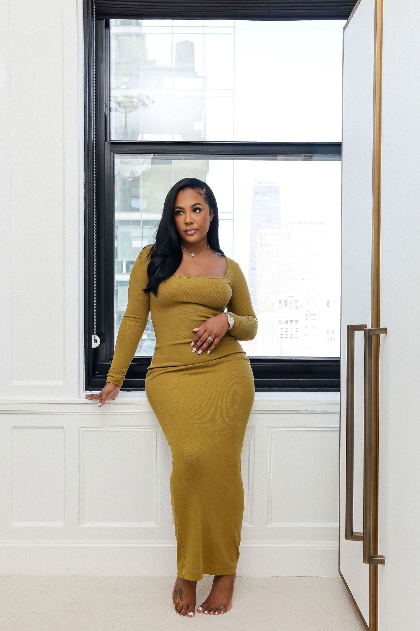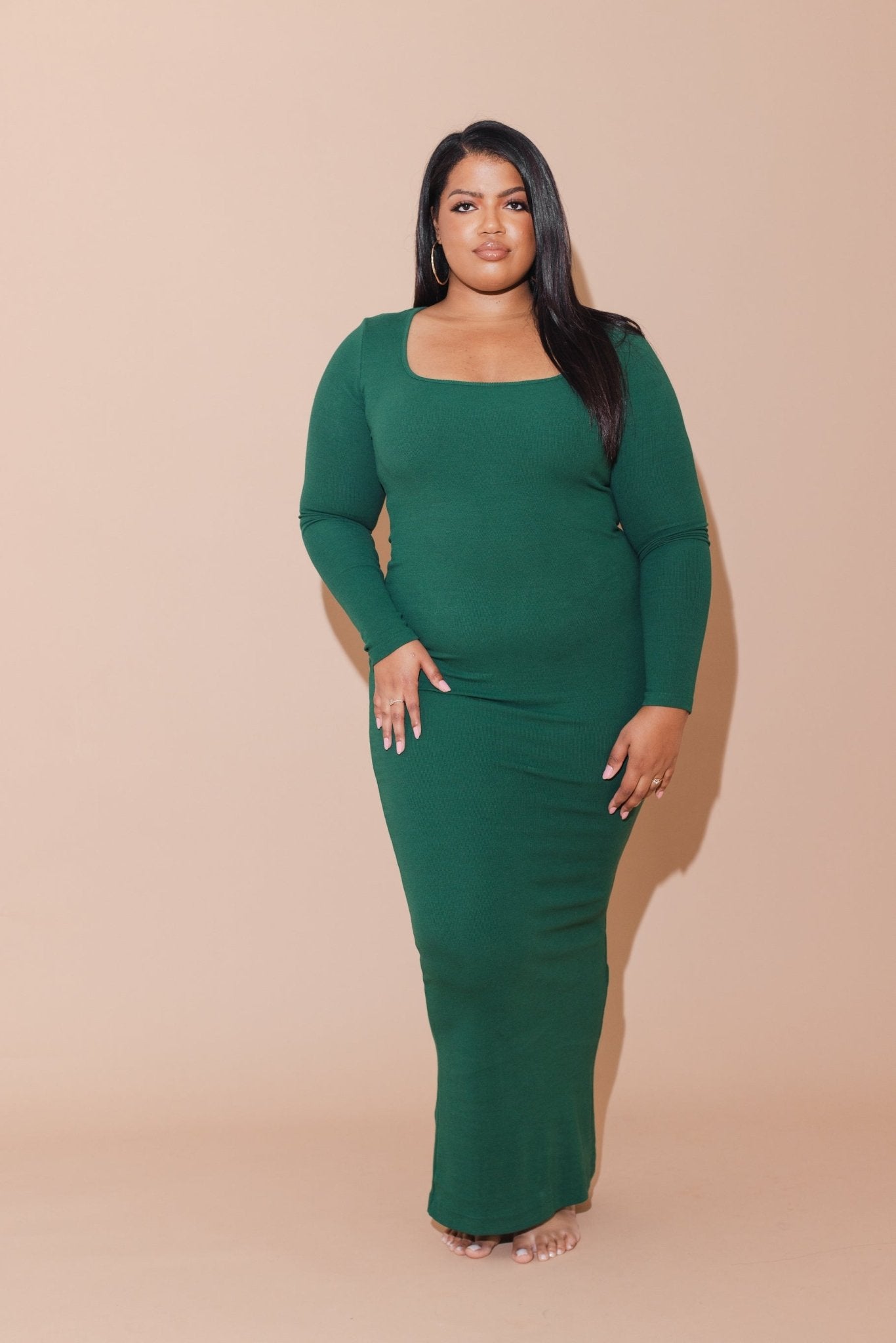 Dress features flattering square neckline, long fitted sleeve, maxi length, an ultra flattering- body hugging fit, with a slight snatch at the waist.