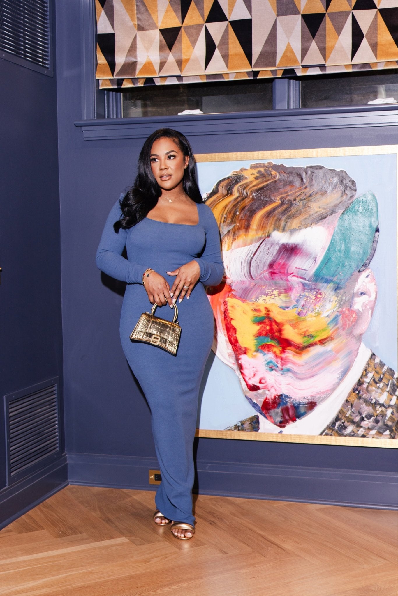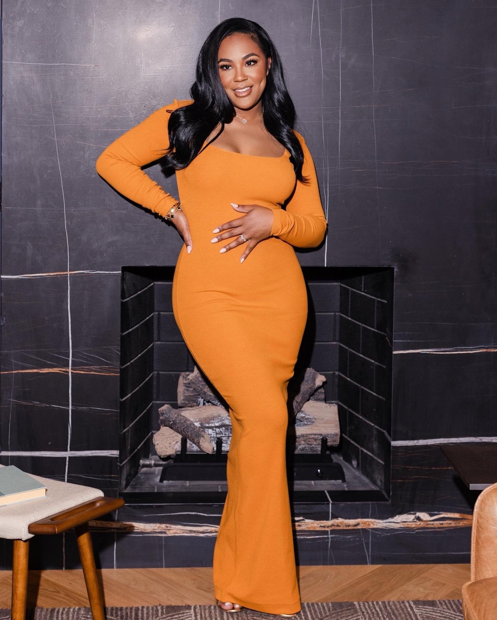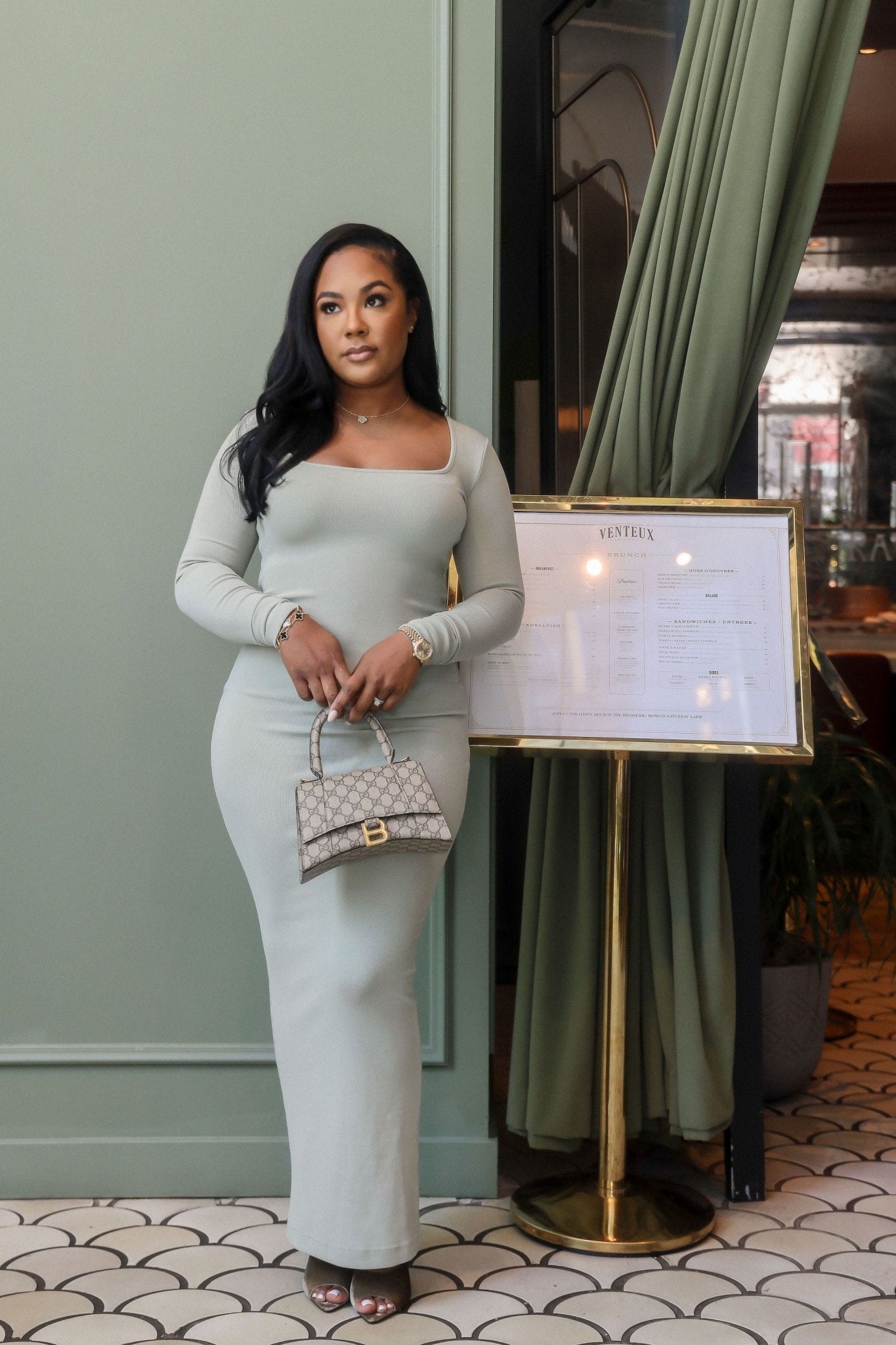 Dress features flattering square neckline, long fitted sleeve, maxi length, an ultra flattering- body hugging fit, with a slight snatch at the waist.
