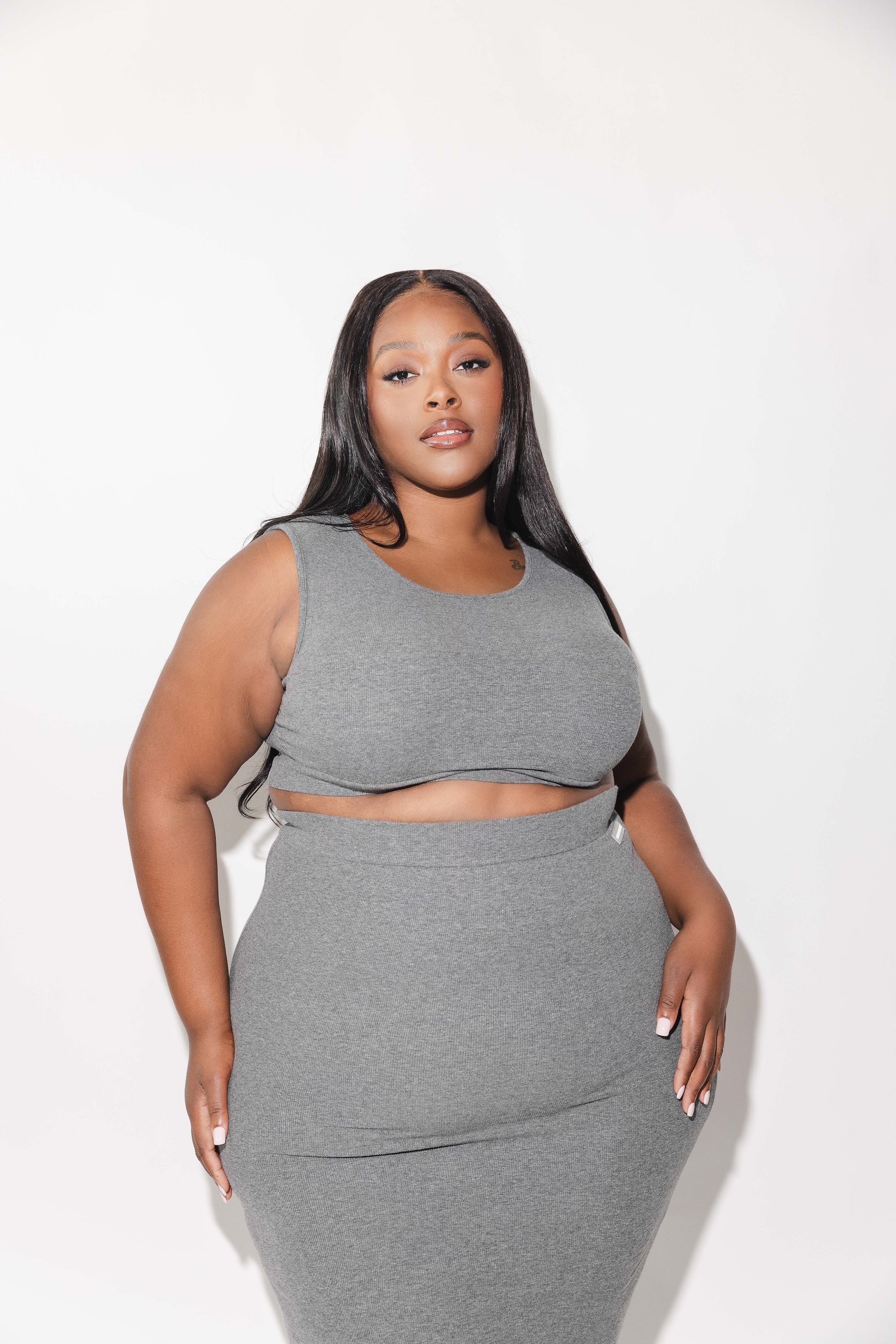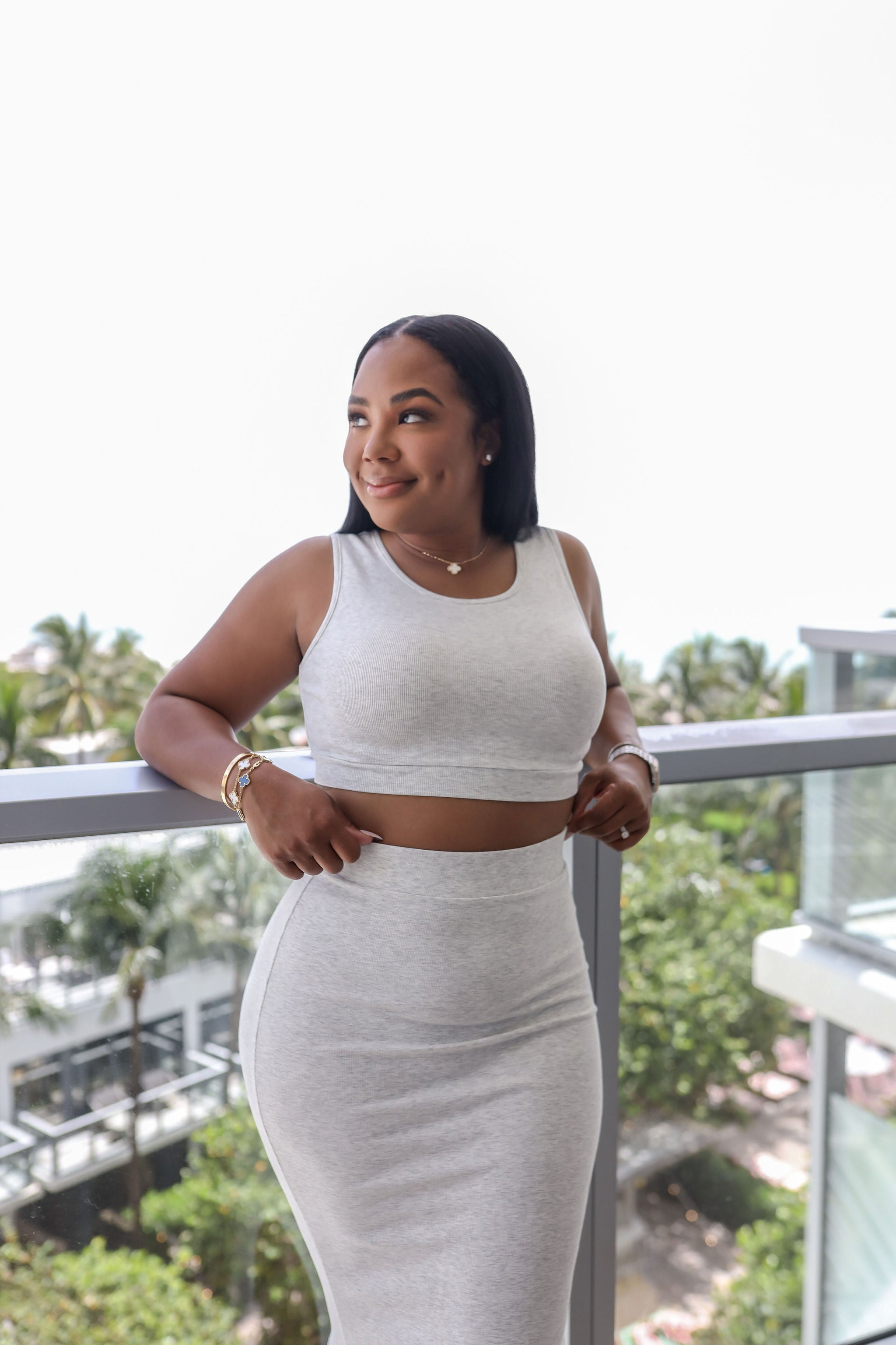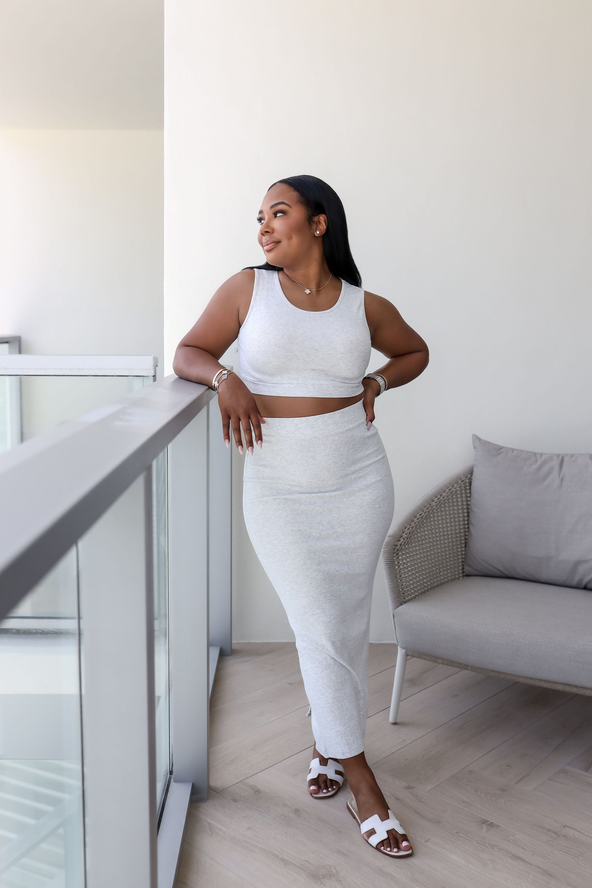 Easy, breezy, effortless! Made from our soft and stretchy Signature Ribbed fabric, this sporty-chic design can easily be dressed up or down! Set features cropped sleeveless tank with a high scoop neckline and matching midi length pencil skirt with back slit for added comfort and ease.