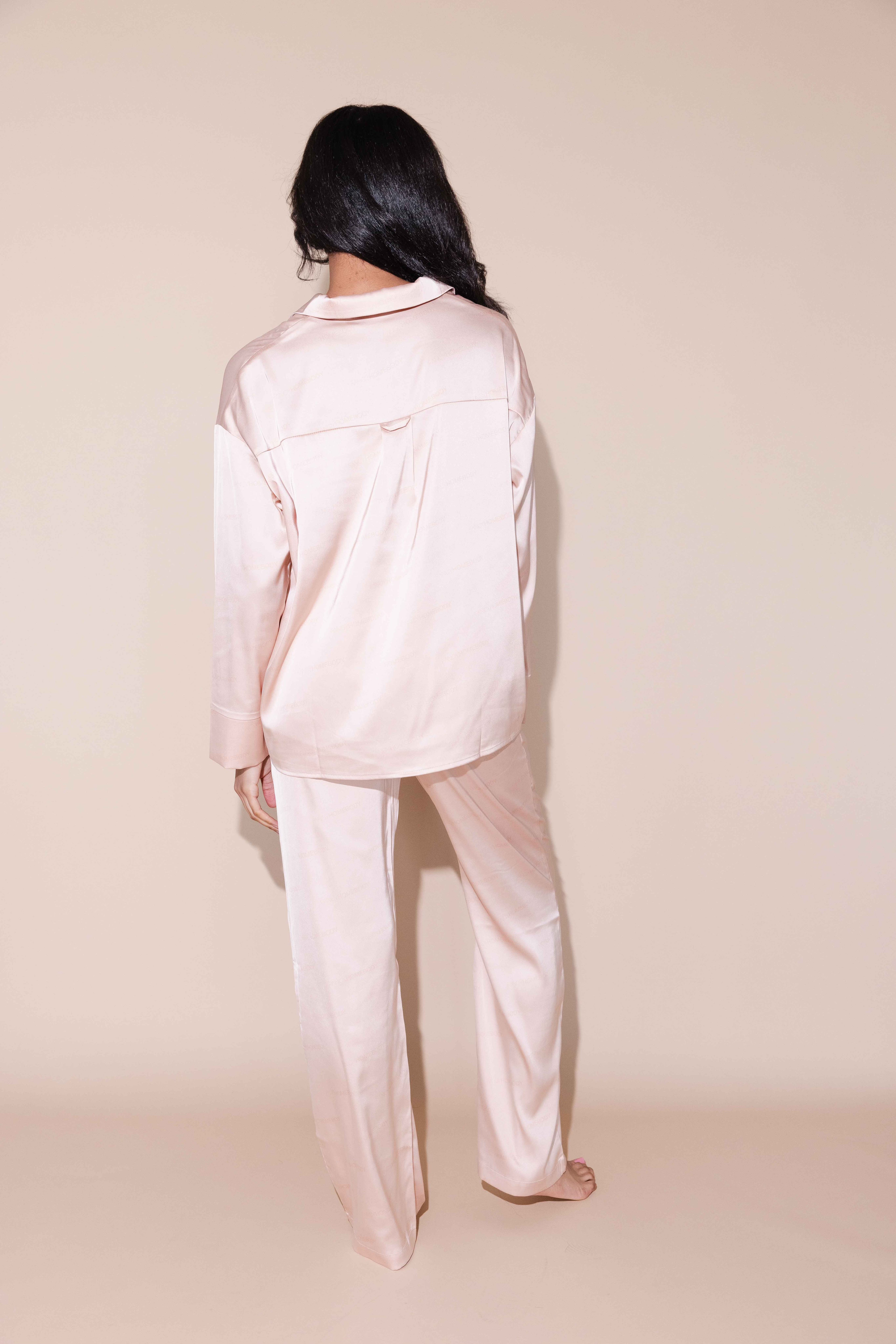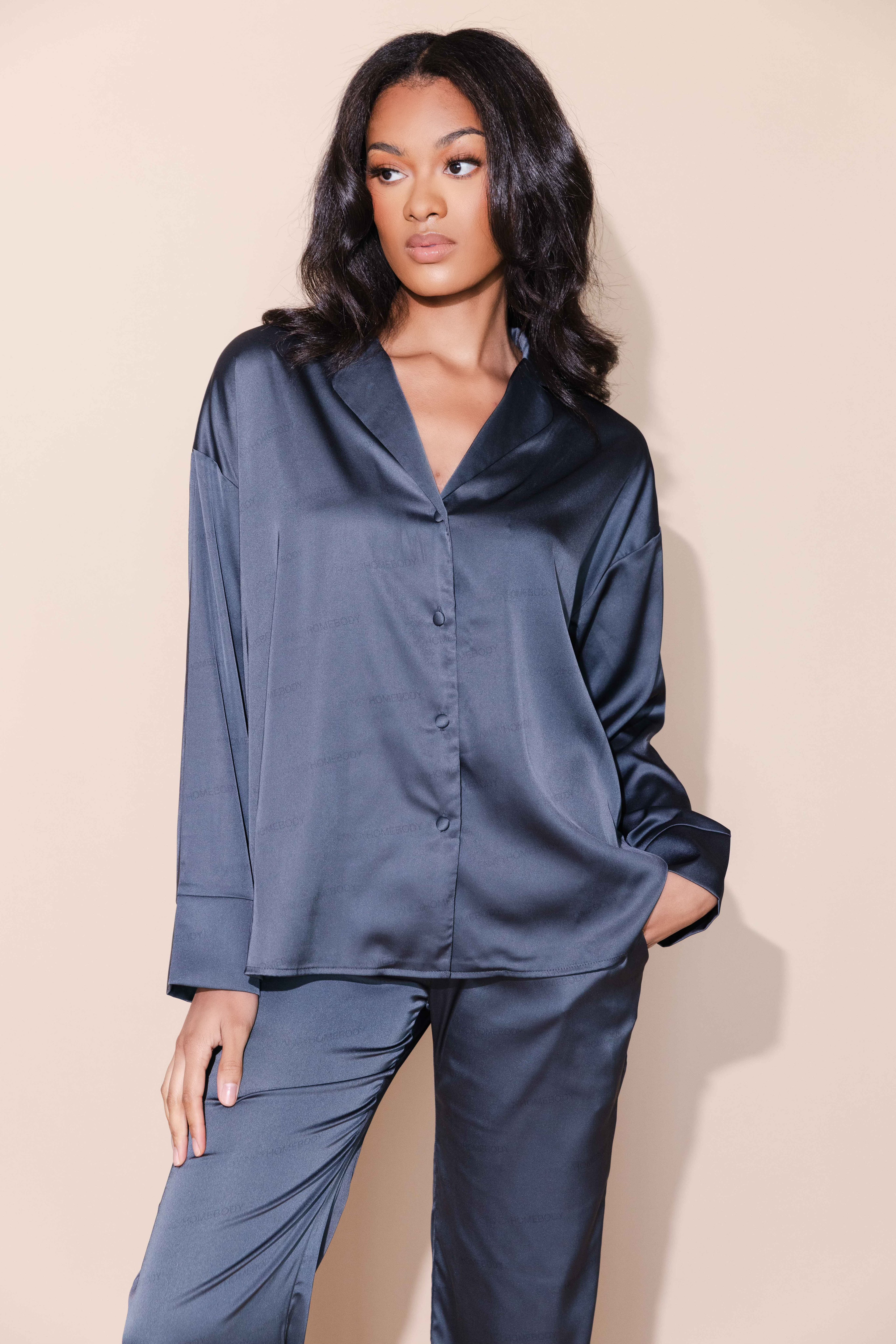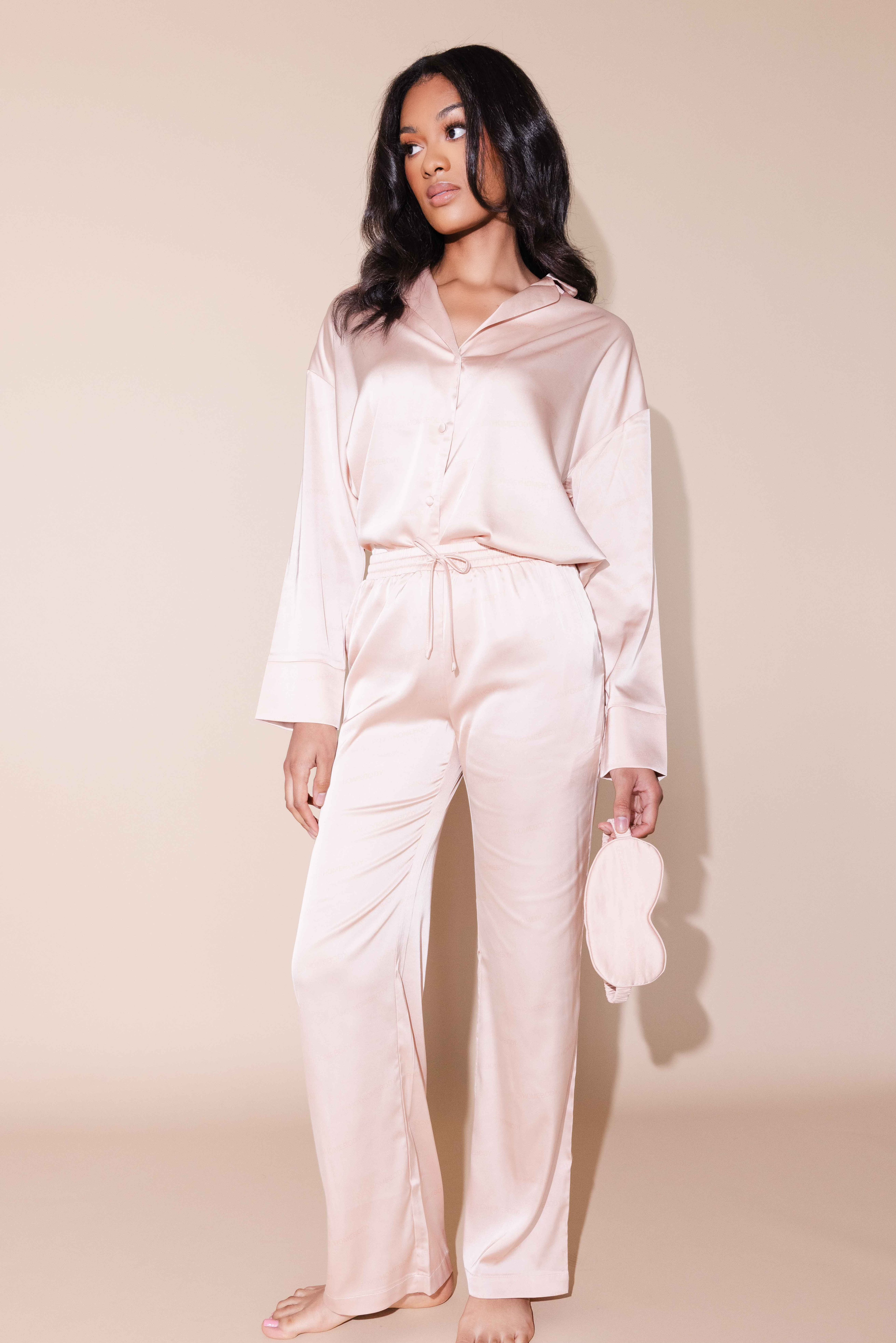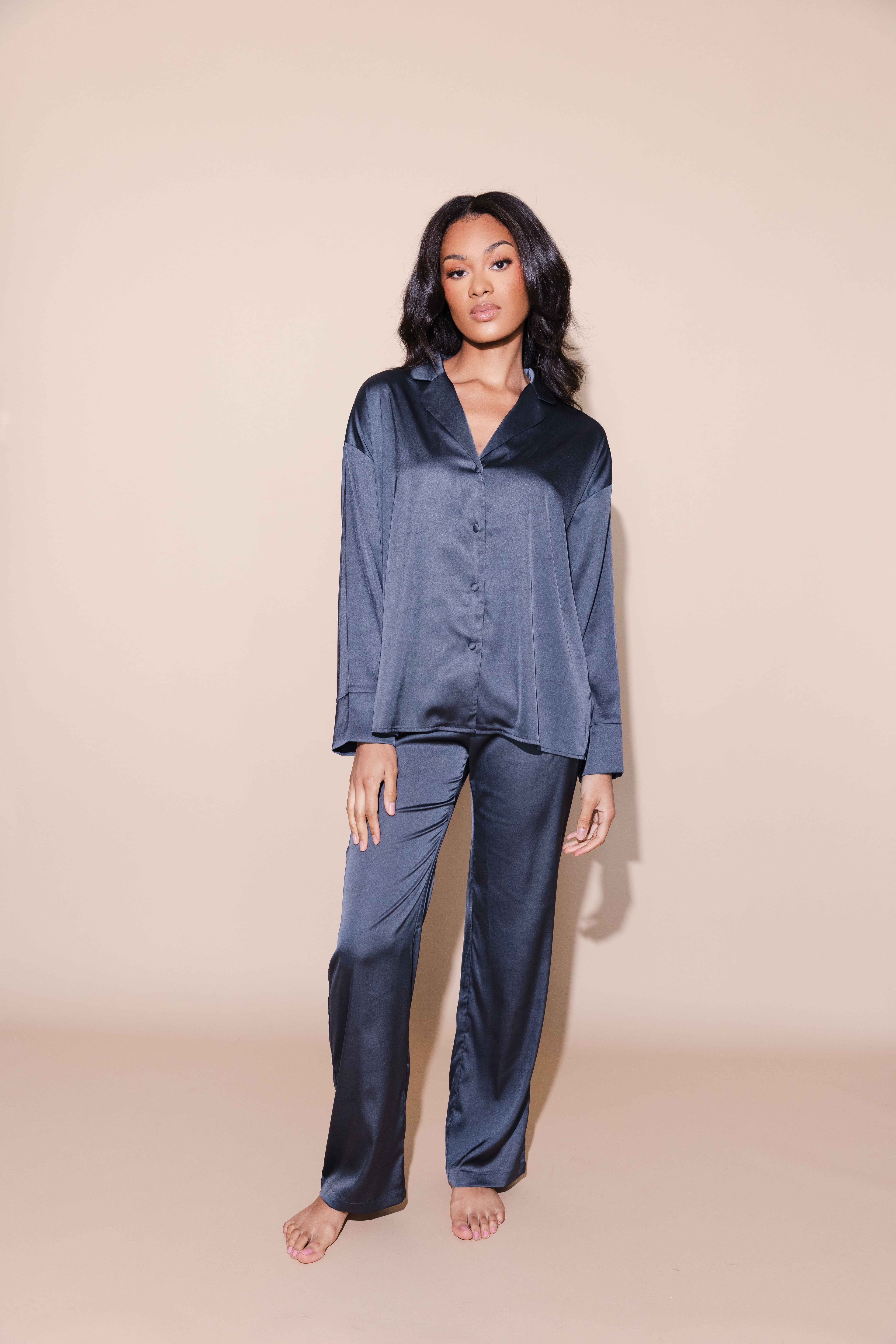 The Long Sleeve Sleep Set is perfect for lounging or sleeping in style. Set features an oversized sleep shirt complete with classic collar lapel and covered buttons. The matching wide leg pants feature a high waistline, drawstring closure and side pockets.