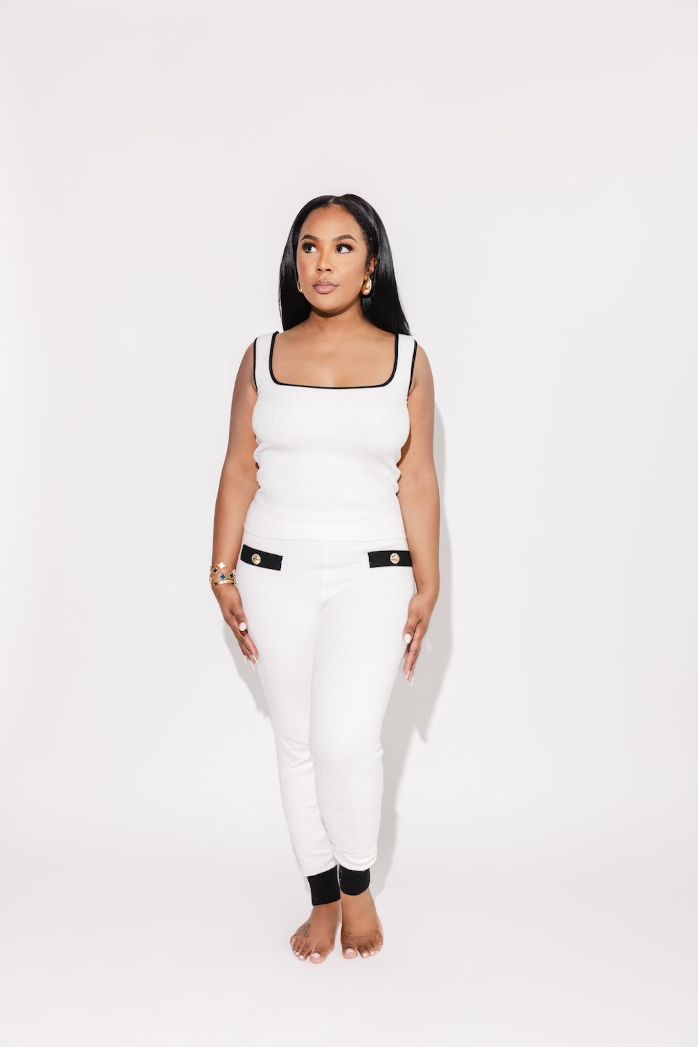 Made from the softest stretch knit, these knit joggers feature a high waistline, two front-mock pockets, and gold logo buttons for an added touch of luxury. The contrasting trim emphasizes the fitted silhouette.